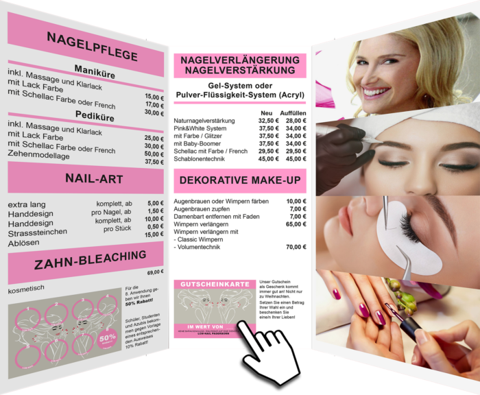 Unsere Preisliste beschreibt gleichzeitig auch unser umfangreiches Leistungsangebot, das weit über nur die Pflege und Gestaltung des Fingernagels hinausgeht.